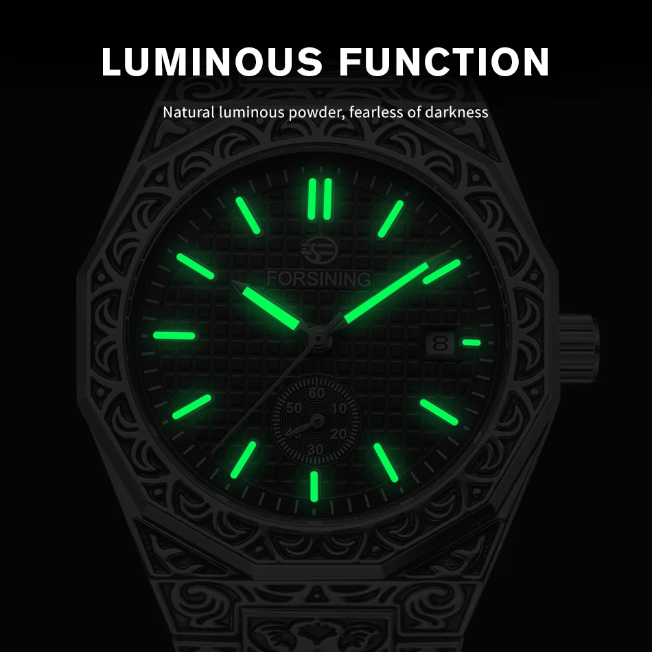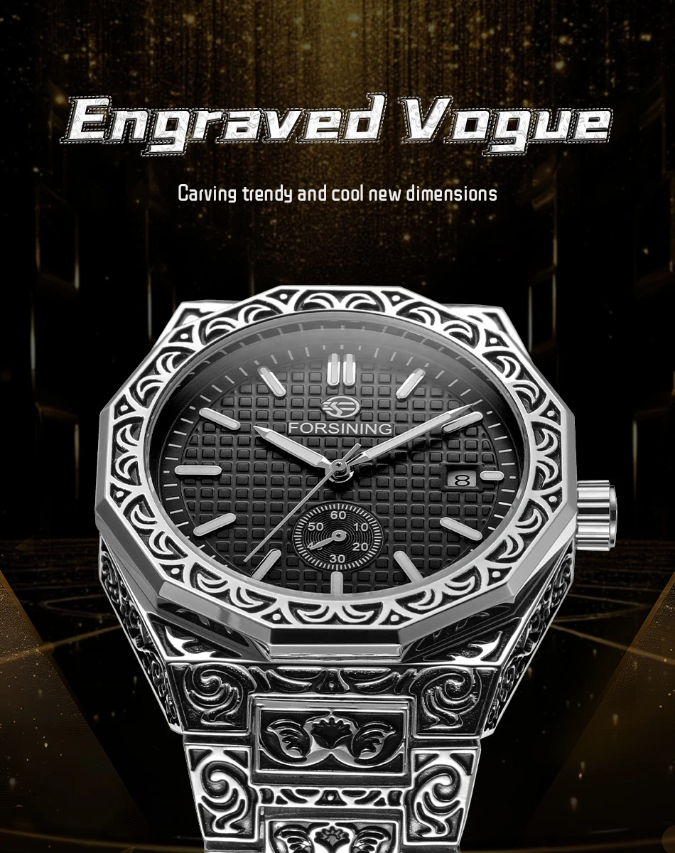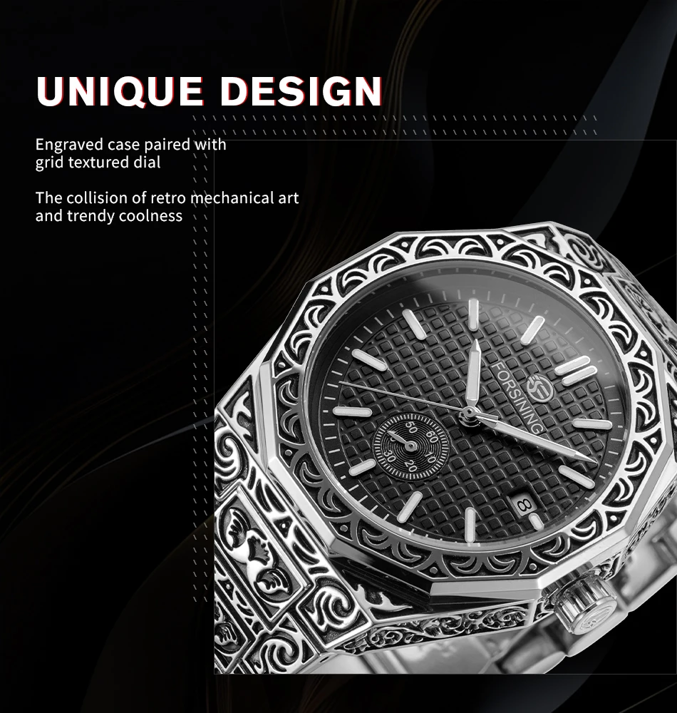 FORSINING (®) 8303 Automatic Mechanical Men’s Watch – Square Case, Engraved Design 30M (3ATM) Water Resistant