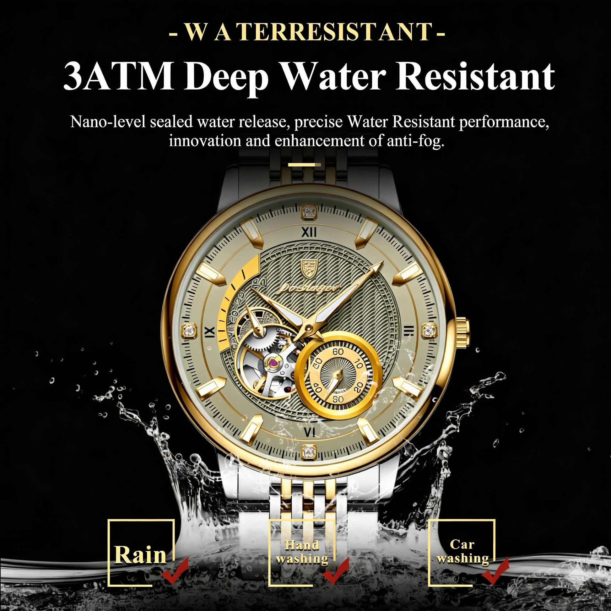3ATM – Splash and rain resistant only (not suitable for swimming or bathing)